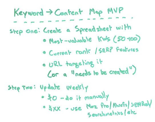 So, all right, let's say we're at the start of our month. We have our hour. I want you to do one of two things, and this is going to be based on if you're technical SEO, meaning if your website is using WordPress and it's pretty much nicely crawlable, maybe you've signed up for Google Search Console, you don't see a lot of errors, there's not a lot of issues, you haven't created a bunch of technical data on your website in the past, great, fine, then you're going to be focused on keywords and content. A keyword to content map, which is something we've discussed here on Whiteboard Friday — I'd urge you to check that video out if you haven't yet — but I'm going to make an MVP version, a very, very small version that can help a little bit.