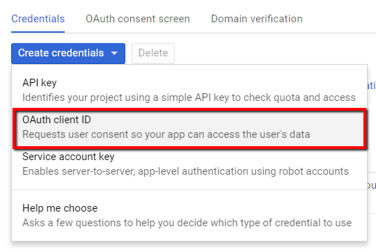 So how do we get our Google API key? Once we’ve enabled the API, we select the "Credentials" tab and then create credentials. The three main kinds of API key are a basic text key, user OAuth credentials, and service account keys.