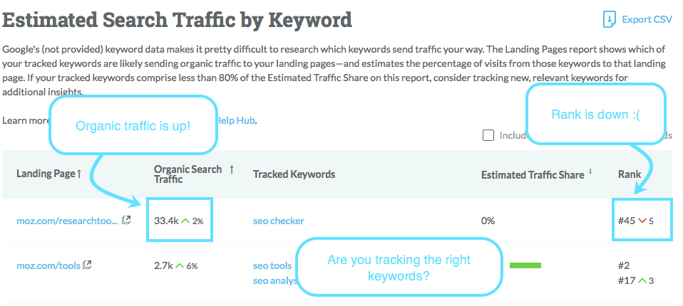 If your organic traffic from search is increasing but your ranking is dropping off, it’s an indication that this keyword isn’t the driving force.
